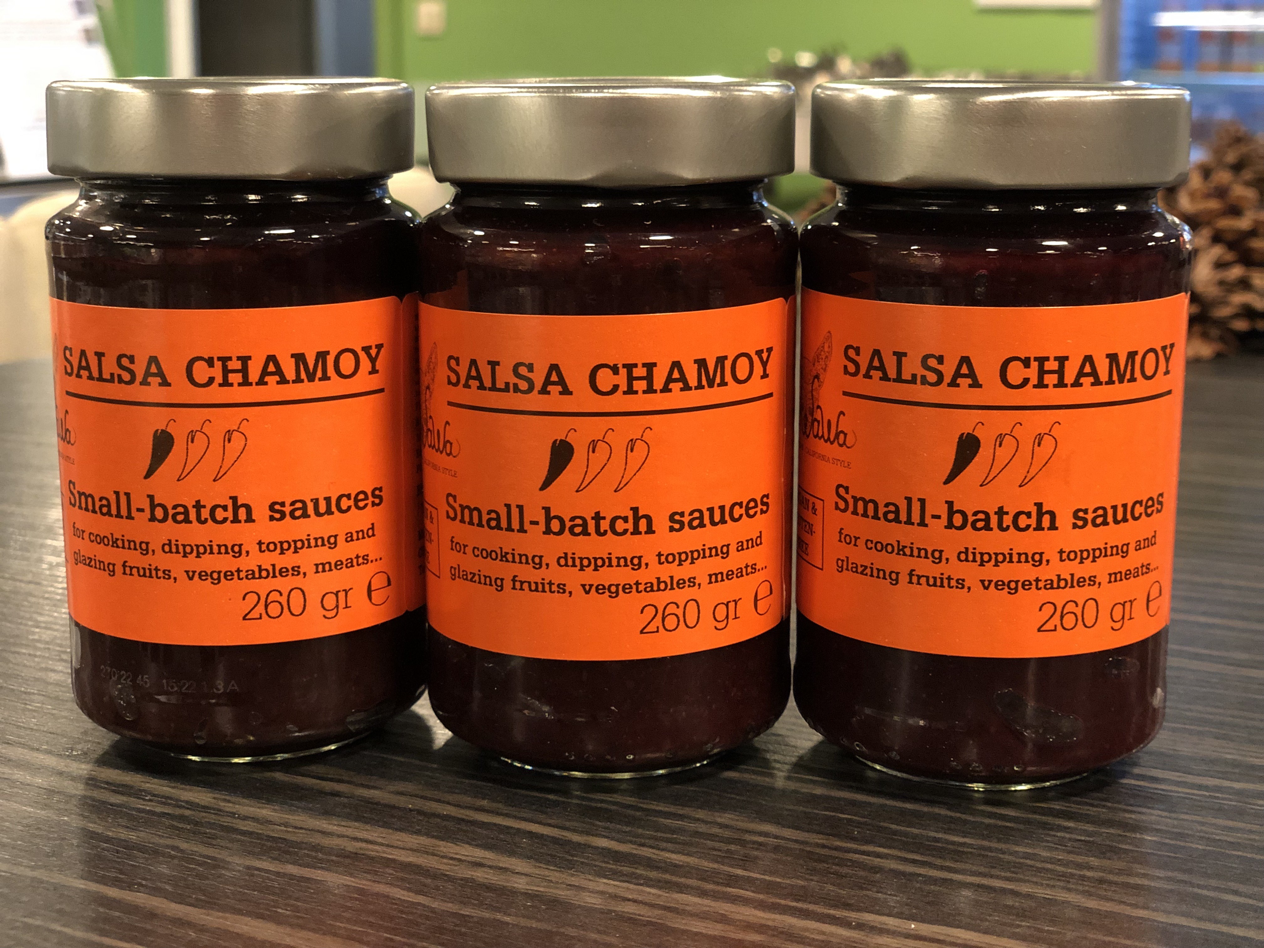 CHEZWaWa's small batch SALSA CHAMOY is mild-spicy (1 pepper spicy) and perfect for dipping, topping, and glazing meats, fish, fruits and vegetables. Containing more than 50% fruits, it's sweet, salty, tangy and a bit spicy - all at the same time!